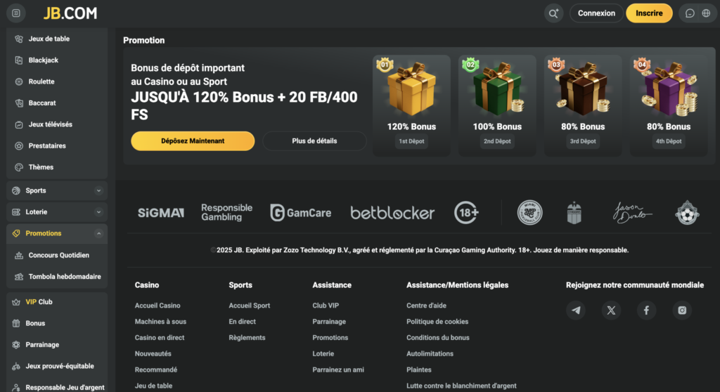 Jusqu’à 120 % de bonus + 400 tours gratuits sur les 4 premiers dépôtsⓘ Réservé aux nouveaux utilisateurs, 18+. Offre valable sur les 4 premiers dépôts après création du compte et validation de l’e-mail ou du numéro de téléphone (vérification d’identité pouvant être exigée). Dépôt minimum : 5 $ pour les 1er et 2e dépôts, 10 $ pour les 3e et 4e dépôts. Structure du bonus : 1er dépôt 120 % jusqu’à 1 000 $ + 100 tours gratuits, 2e dépôt 100 % jusqu’à 1 000 $ + 100 tours gratuits, 3e dépôt 80 % jusqu’à 1 000 $ + 100 tours gratuits, 4e dépôt 80 % jusqu’à 1 000 $ + 100 tours gratuits. Les tours gratuits doivent être réclamés dans les 24 heures suivant leur crédit et utilisés dans les 24 heures suivantes, sinon ils expirent. Exigence de mise : le dépôt et le bonus doivent être rejoués x40 ; les gains issus des tours gratuits doivent également être rejoués x40. Contribution aux mises : machines à sous tierces 50 % à 100 %, jeux originaux 5 %, jeux de table et live casino 0 %. Mise maximale pendant le wagering : 5 $. Les bonus doivent être misés dans un délai de 30 jours après activation, faute de quoi le bonus et les gains associés sont annulés. Les gains issus des tours gratuits sont plafonnés à 10 $ retirables. Le montant maximum pouvant être converti depuis un bonus ne peut pas dépasser 100 % du montant du bonus accordé. Toute demande de retrait annule les bonus actifs non complétés. Un seul bonus par joueur, foyer, IP et appareil. JB.COM se réserve le droit de modifier ou annuler l’offre et de suspendre les comptes en cas d’abus. T&Cs applicables.